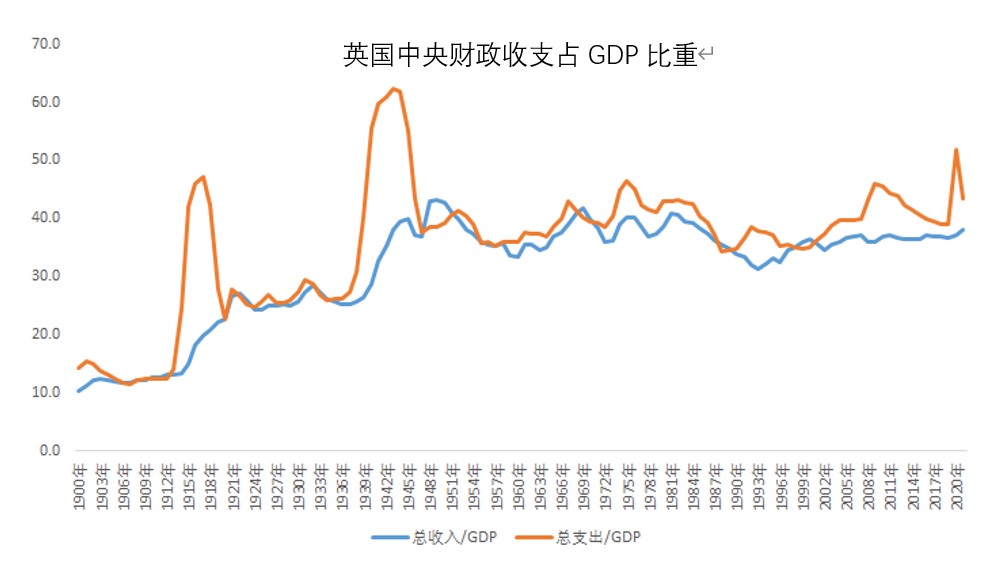 如何救助经济和未来高企的失业率?我想不出太多的想法,也许英国1945年之后的行为可供参考。英国采用的是对富裕阶层高赋税、国有化、高福利、基建(战争修复)等,和罗斯福新政如出一辙,(如下图我们能看到英国中央财政税收从占GDP的10%上升到40%,并没有算地方政府财政税收,地方政府财政税收占GDP大约在25%左右)。1945年之后的英国进入了最早的高福利国家。如果美国因为政治原因无法实现对最富裕人群高征税,如何面对两极分化和高额财政赤字,也许就是一个比较大的问题。唯有罗斯福新政才能缓解相应的问题。